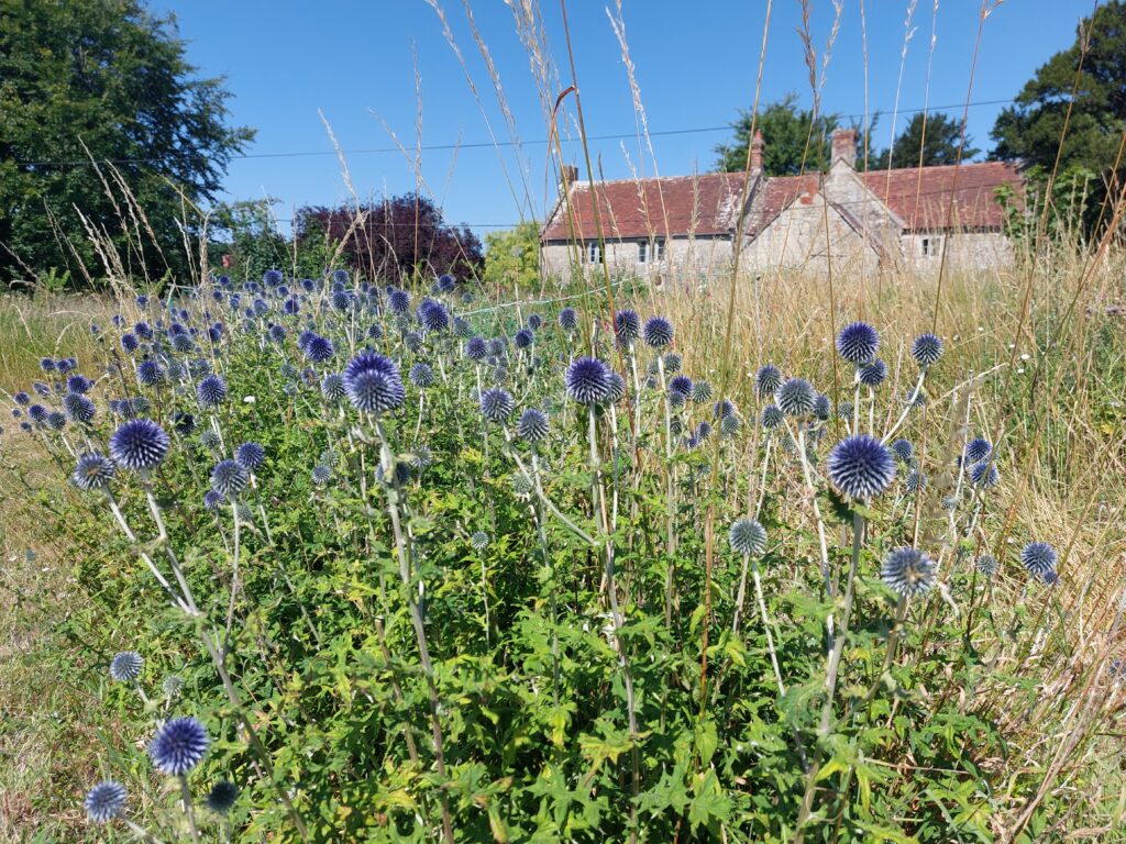 Do we grow globe thistle (echinops) or do they grow themselves? We did plant a few, way back but since then I think they have pretty much grown themselves. With many perennials we have a problem keeping the perennial weeds out but echinops is tough. I love electric blue and this is also a great flower for drying (though not pressing), because of its shape and structure.